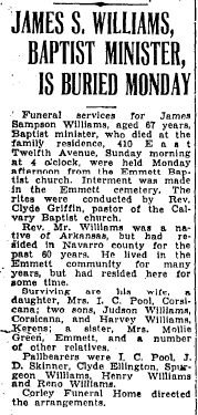 JAMES S. WILLIAMS, BAPTIST MINISTER, IS BURIED MONDAY Funeral services for James Sampson Williams, aged 67 years, Baptist Minister, who died at the family residence, 410 East Twelfth Avenue, Sunday morning at 4 o'clock, were held Monday afternoon from the Emmett Baptist church. Interment was made in the