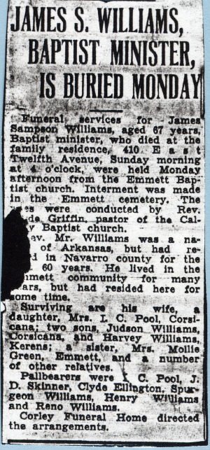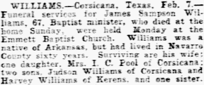 WILLIAMS - Corsicana, Texas. Feb. 7. - Funeral services for James Sampson Williams, 67, Baptist minister, who died at the home Sunday, were held Monday at the Emmett Baptist Church. Williams was a native of Arkansas, but had lived in Navarro County sixty years. Surviving are his wife; one daughter, Mrs. I C. Pool of Corsicana; two sons, Judson Williams of Corsicana and Harvey Williams of Kerens, and one sister.