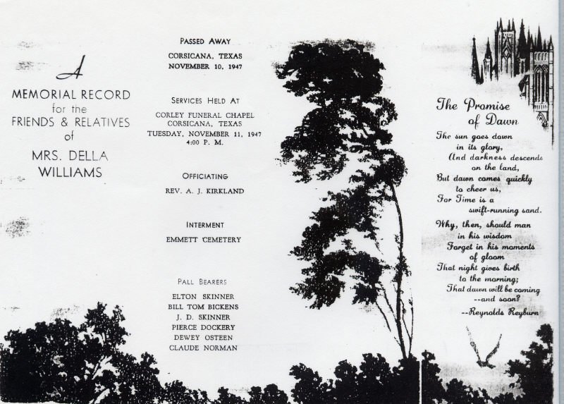 Memorial Record Mrs. Della Williams Passed Away Corsicana, Texas November 10, 1947. Services Held At Corley Funeral Chapel, Corsicana, Texas, Tuesday, November 11, 1047 4:00 P.M. Officiating Rev. A. J. Kirkland. Interment
