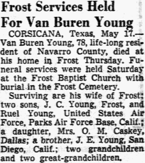 Frost Cemetery. Survivors include a son, J. C. Young of Frost; a daughter, Mrs. O. M. Caskey of Mesquite; two sisters, Mrs. G. W. Webb and Mrs. Alice Green of Corsicana; two grandchildren, seven great-grandchildren, seven great-grandchildren, and two great-great-grandchildren. Pallbearers were to be Truitt Green, Irving Green, J.C. Green, M. R. Green, Paul Green, and Pat Caldwell.