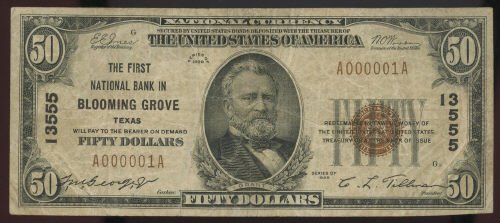 First National Bank of Blooming Grove Charter # 3555 National Currency & Checks Blooming Grove, Navarro County, Texas