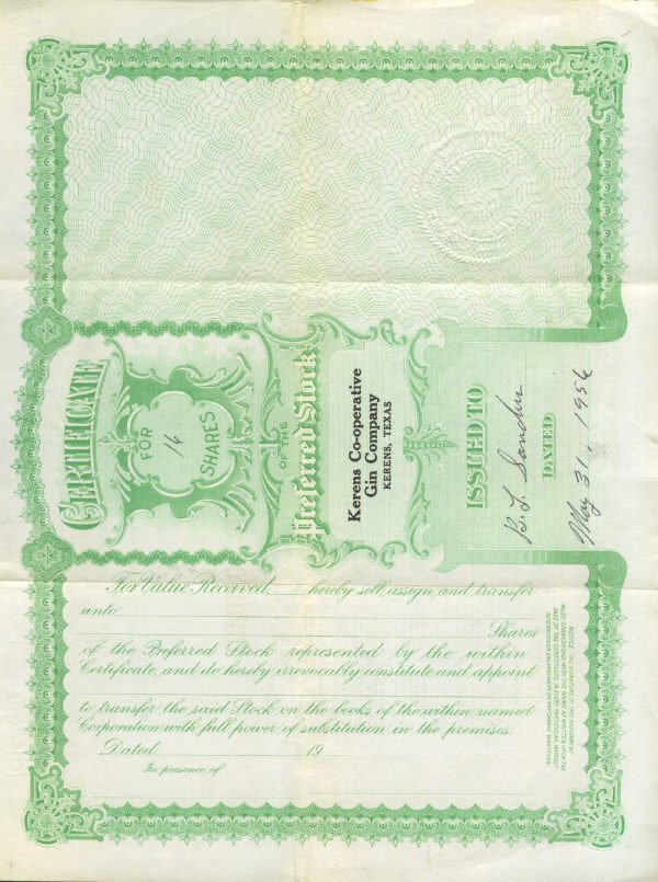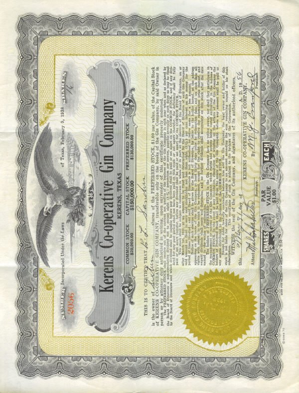 Kerens Co-operative Company Stock Certificate Kerens, Navarro County, Texas