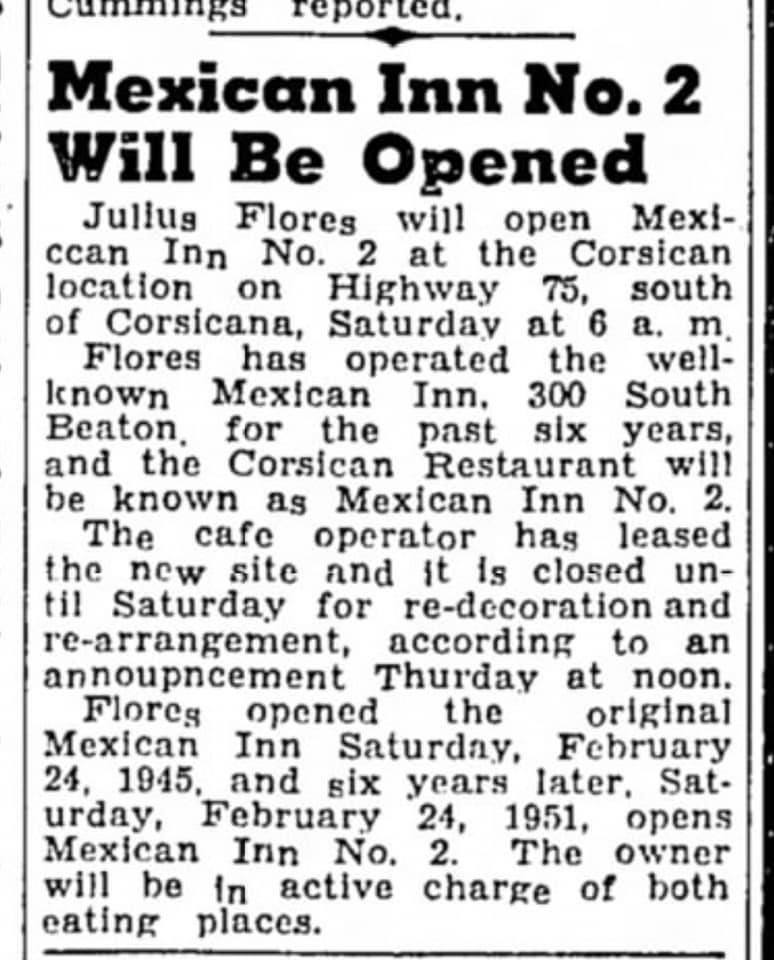 The Mexican Inn was a restaurant that opened in 1940 in downtown Corsicana, TX