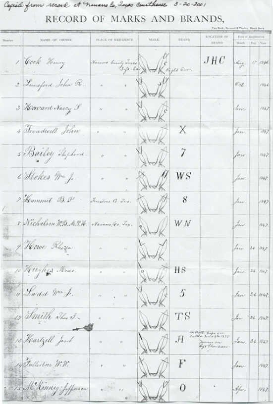 Henry Cook was the first person to register a cattle brand in Navarro County Date 17 August, 1846. He was my great grandfather. Kenneth Cook