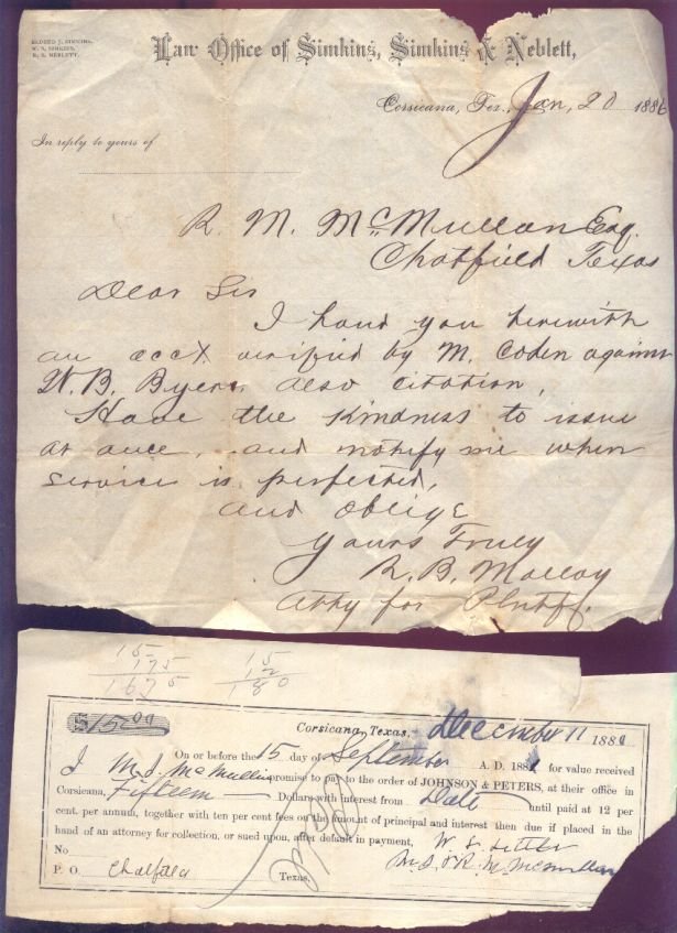 Letter to R. M. McMullan of Chatfield Texas - 1886