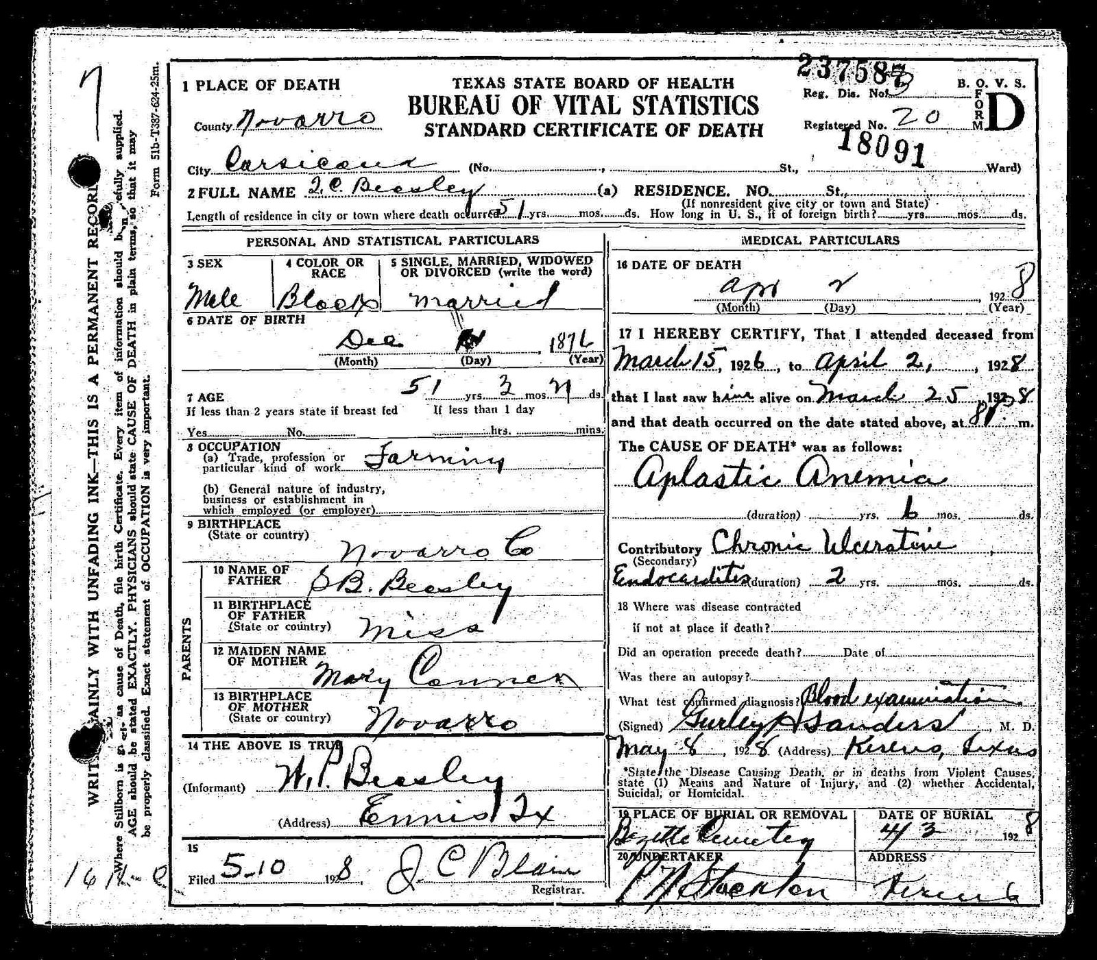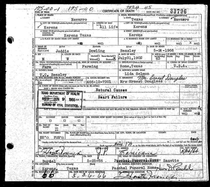 NEVER MARRIED; s/o Thomas Conner Beasley & Lida (Selman)
