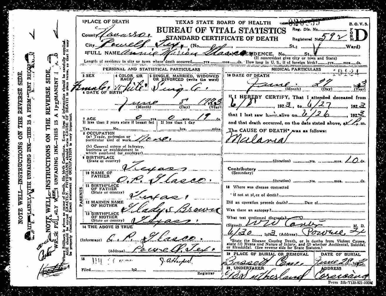 d/o Oney Purvis Glasgow & Gladys Annie (Brown) Glasgow [bur