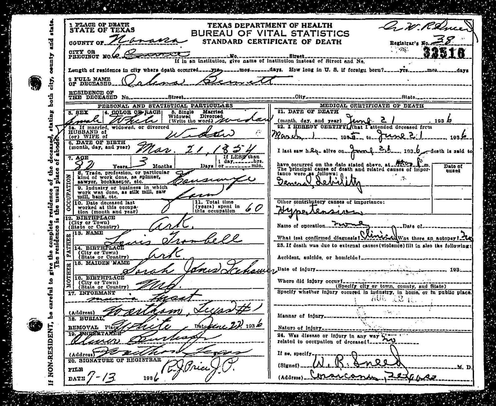 w/o Francis Marion Bennett; d/o Louis Trombell &