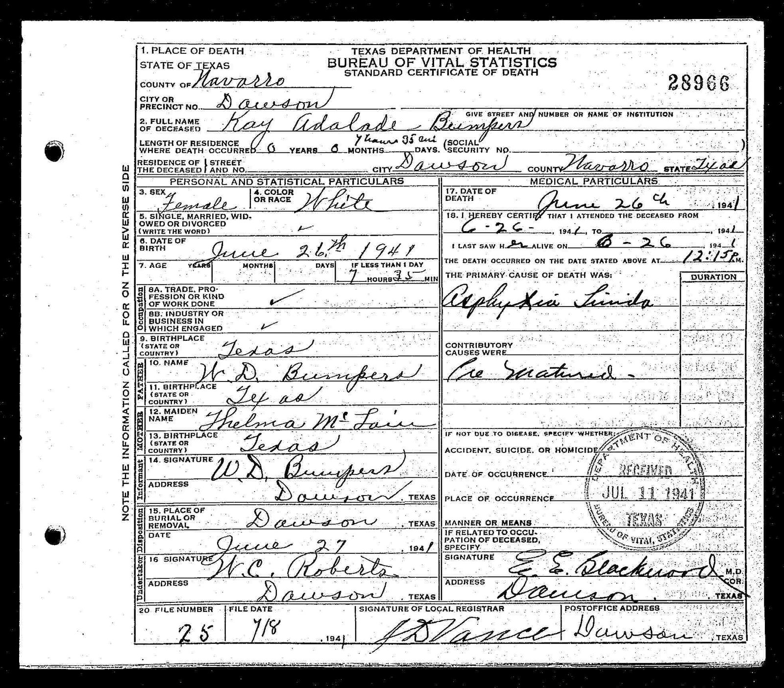 d/o William Doyle Bumpers & Thelma Adelaide (McClain) Bumpers |