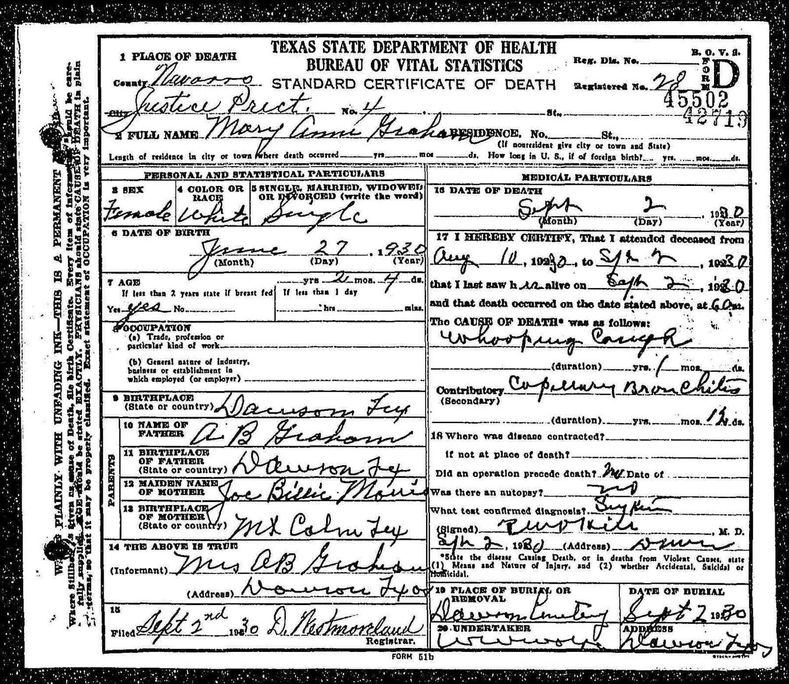 d/o A. B. Graham & Joe Billie (Morris) Graham |