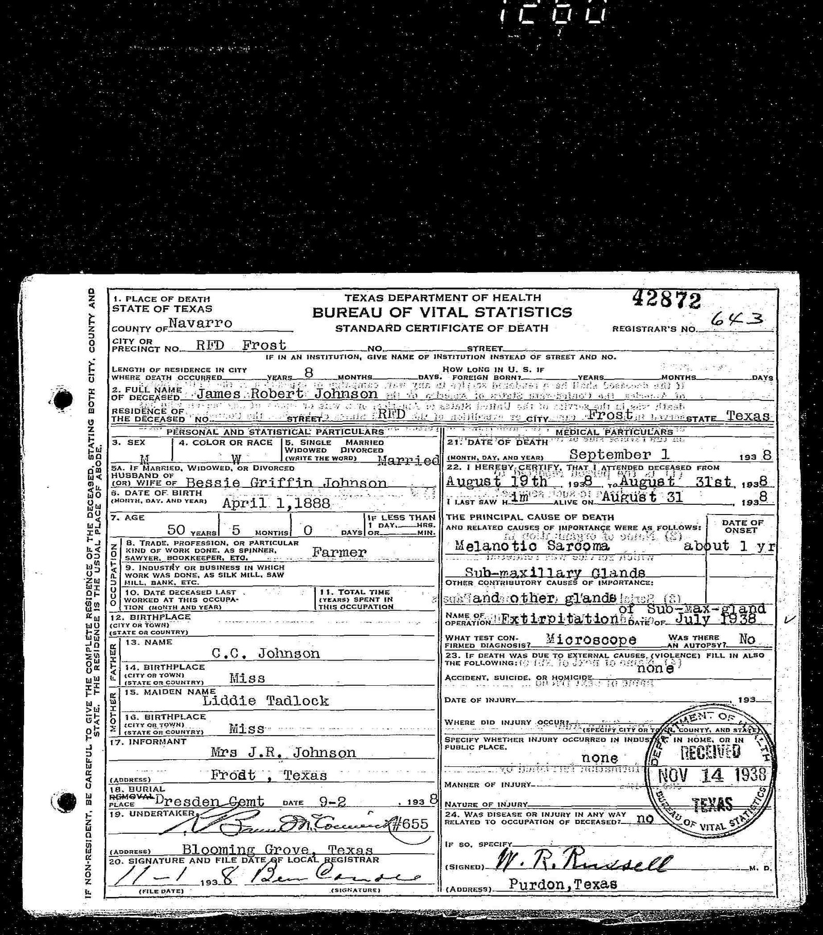 [buried in Oakwood Cemetery in Corsicana, TX]