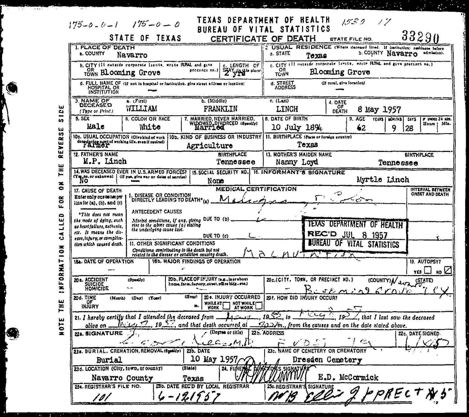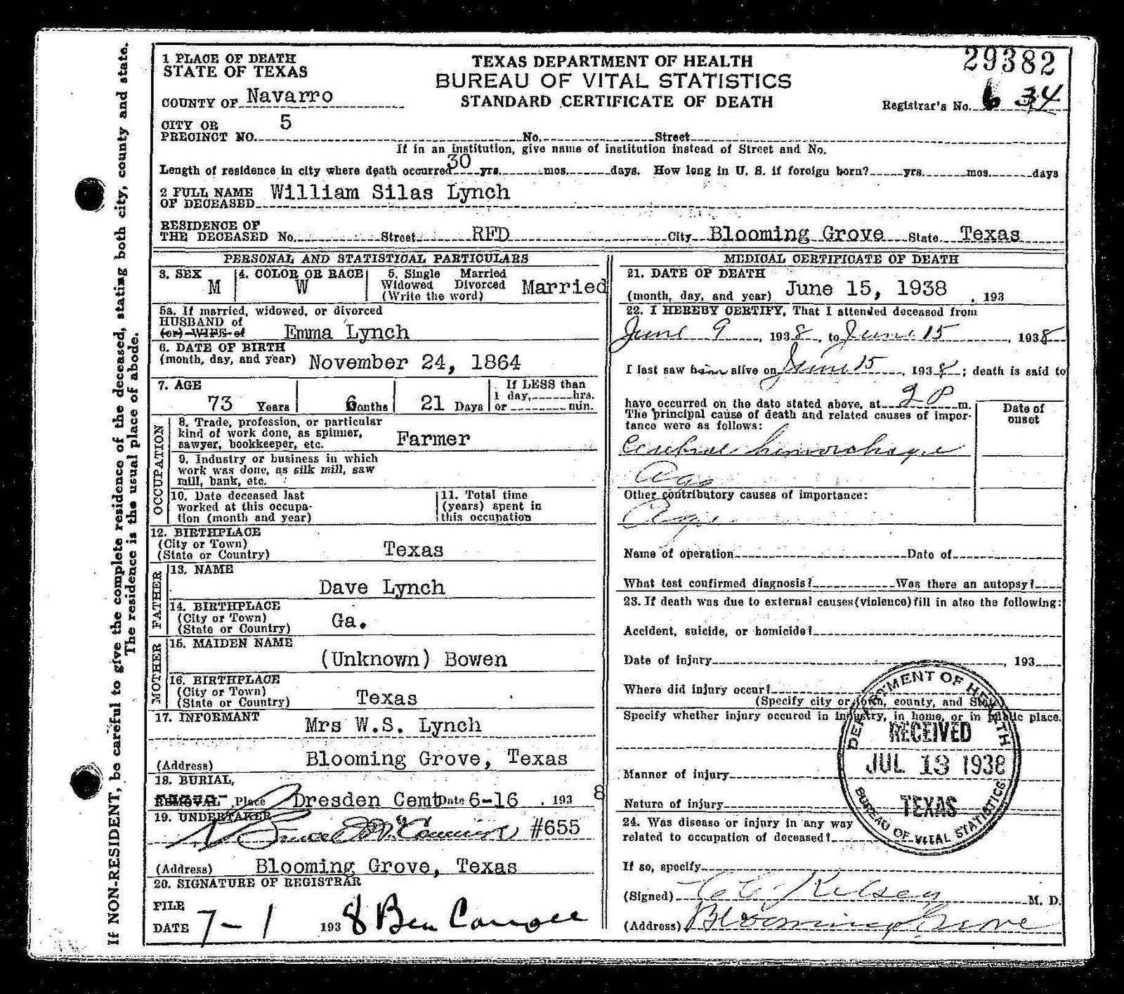 h/o Emma Blanche (Parham) Lynch; s/o William David