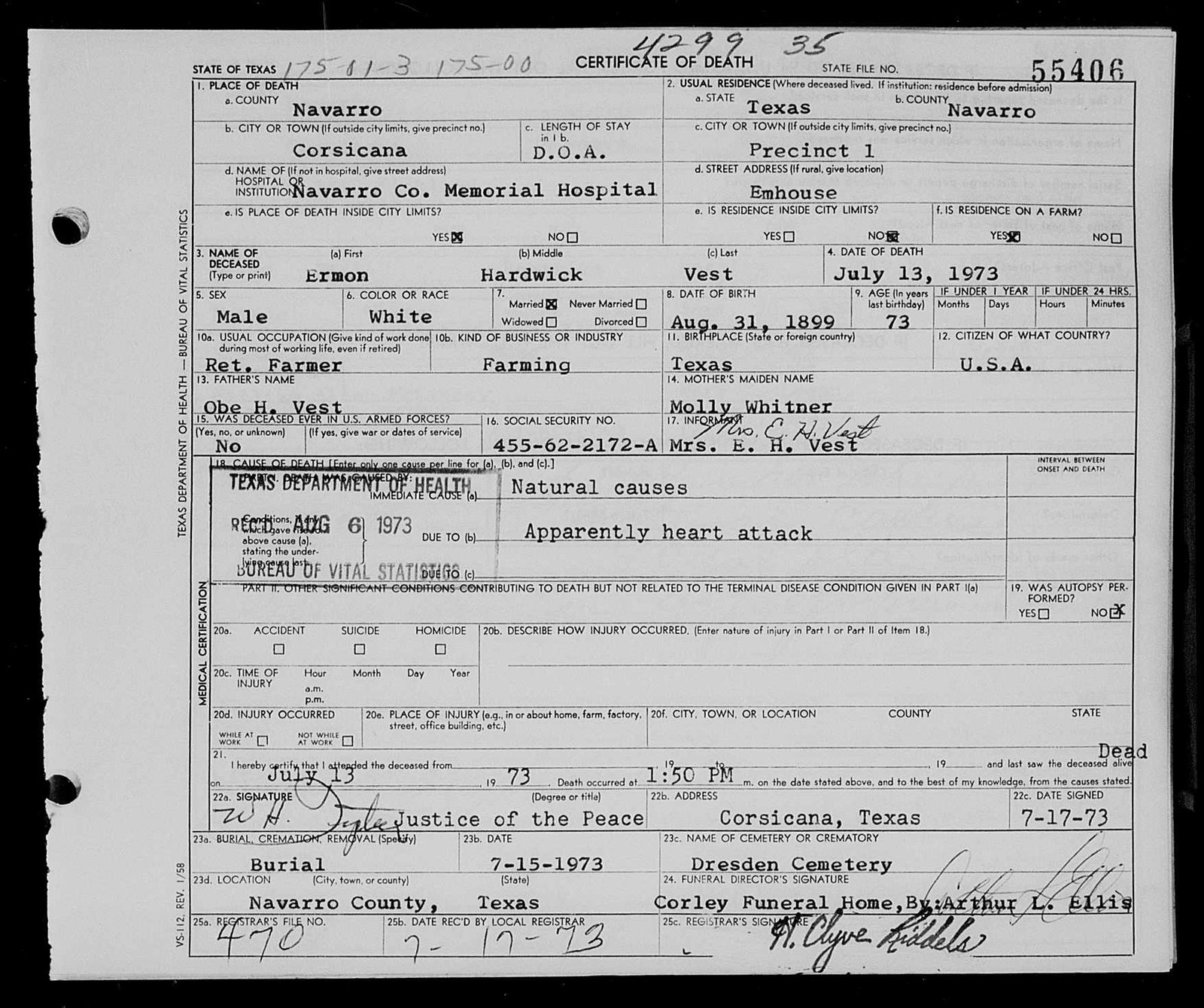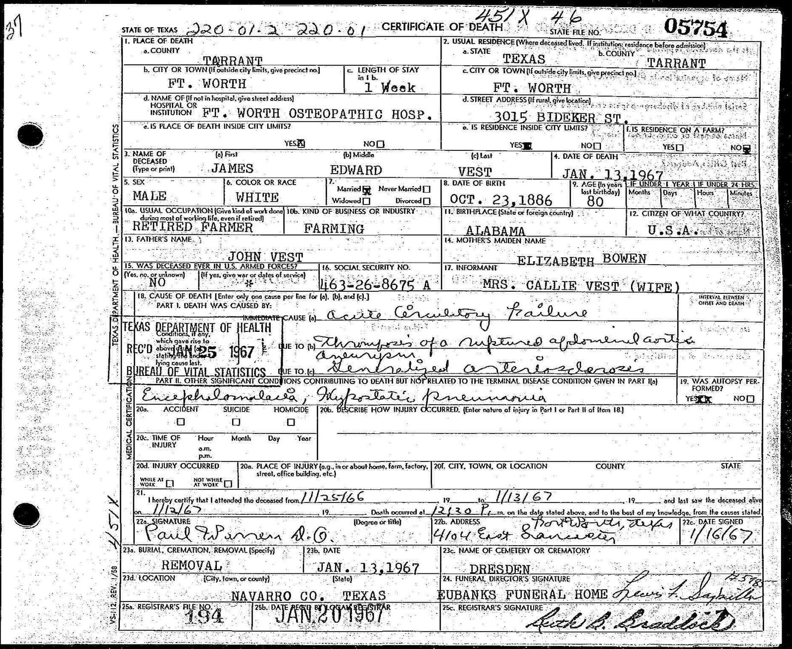 h/o Mary Louise (Mosier) Vest; s/o Maxie Vest & Aliene Marie (Holliefield) Vest