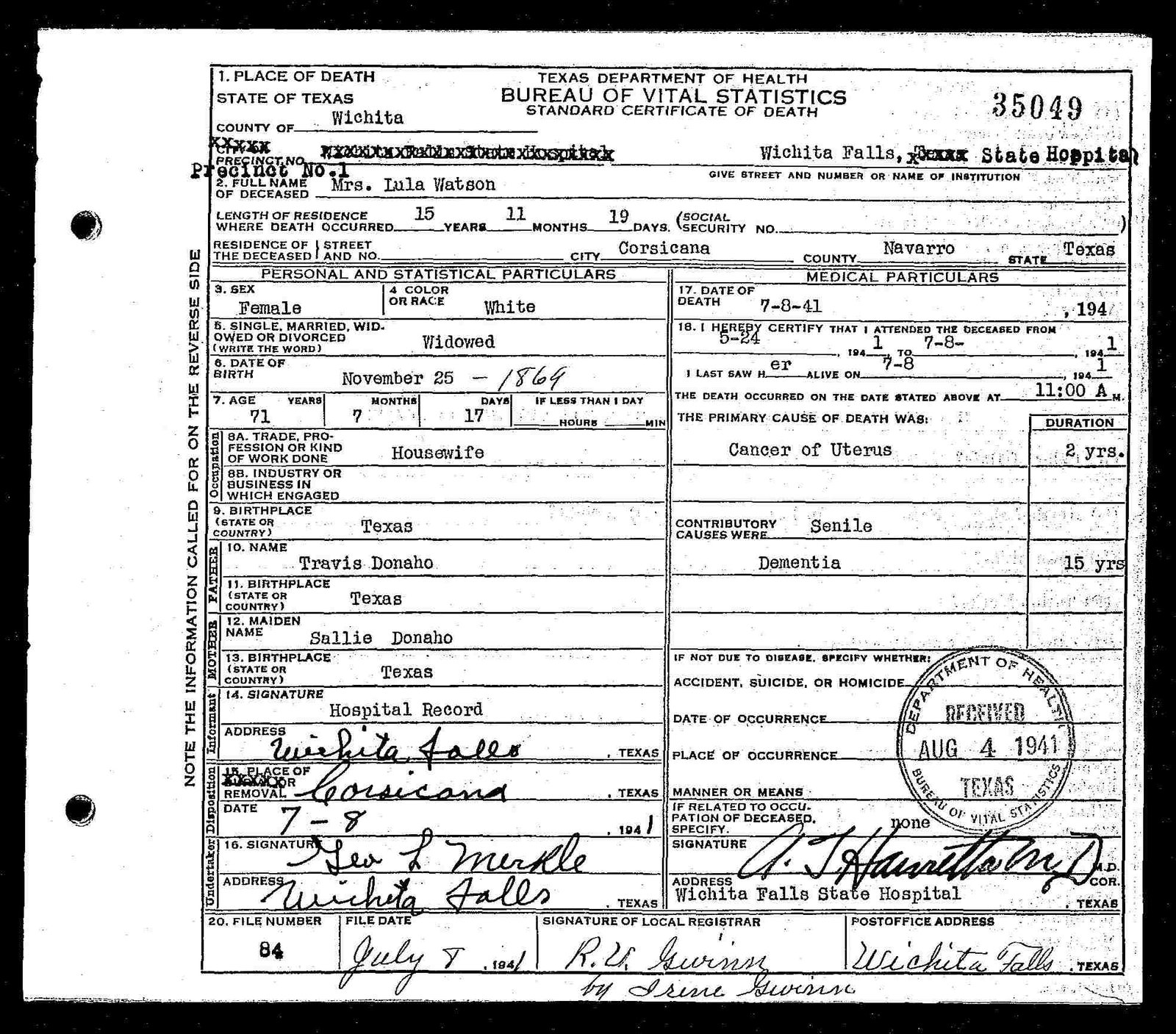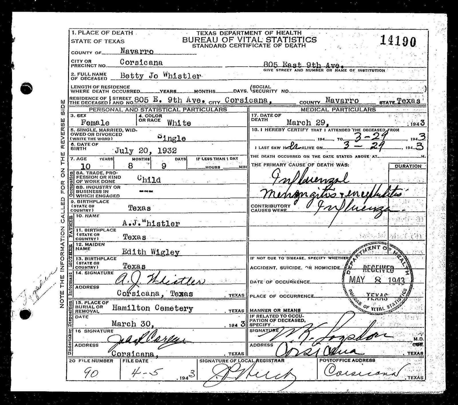 Swink buried in Dawson Cemetery, Dawson, TX |