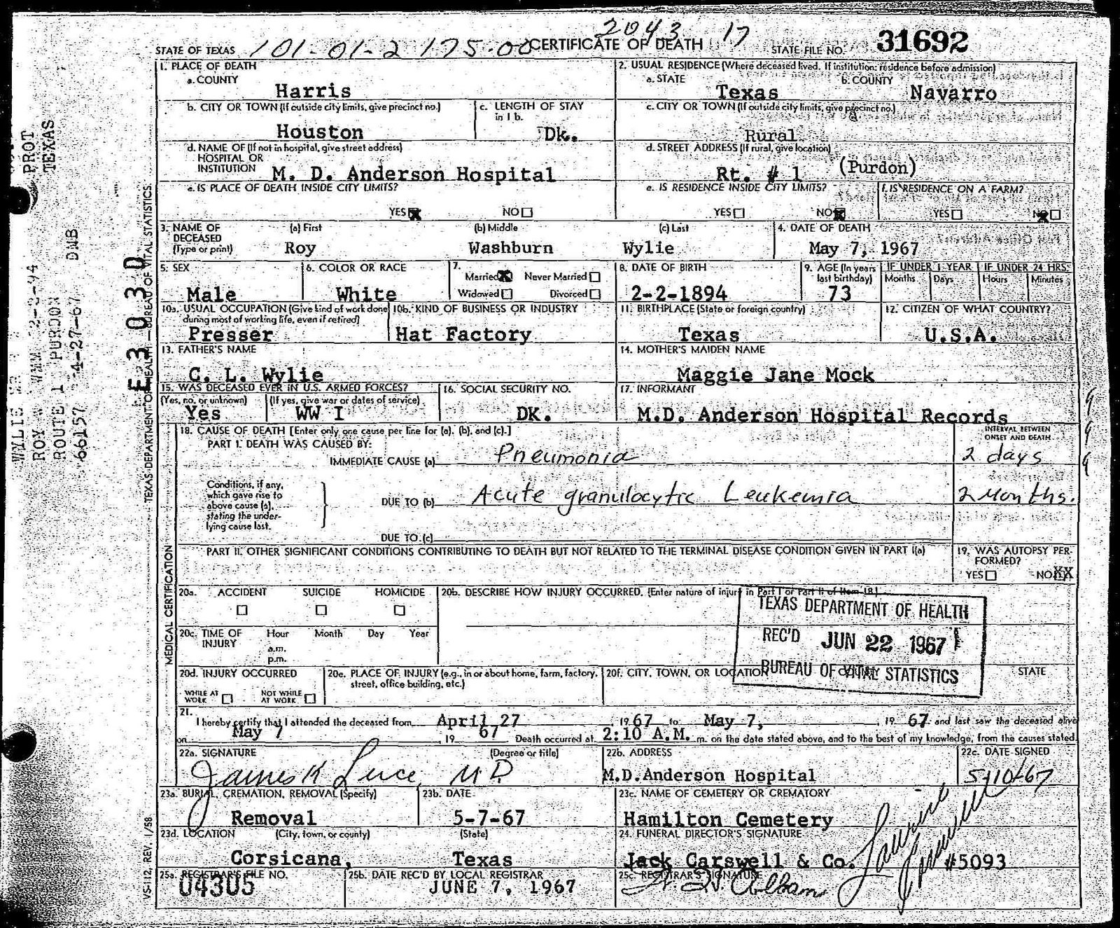 h/o Clara Belle (Cason) Wylie; s/o Collet Lee Wylie & Margaret