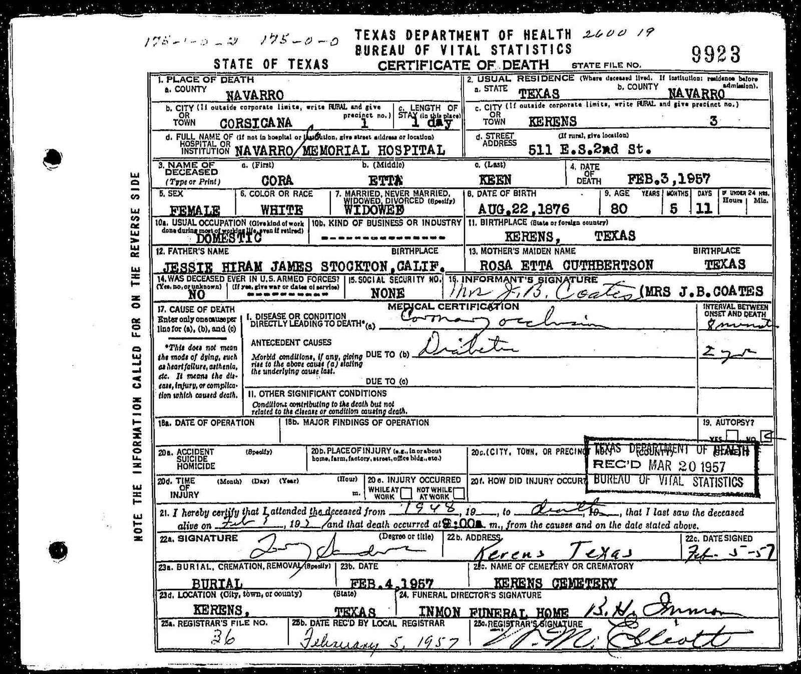 h/o Cora Etta (Stockton) Keen; s/o Newton Asbury Keen & Mary