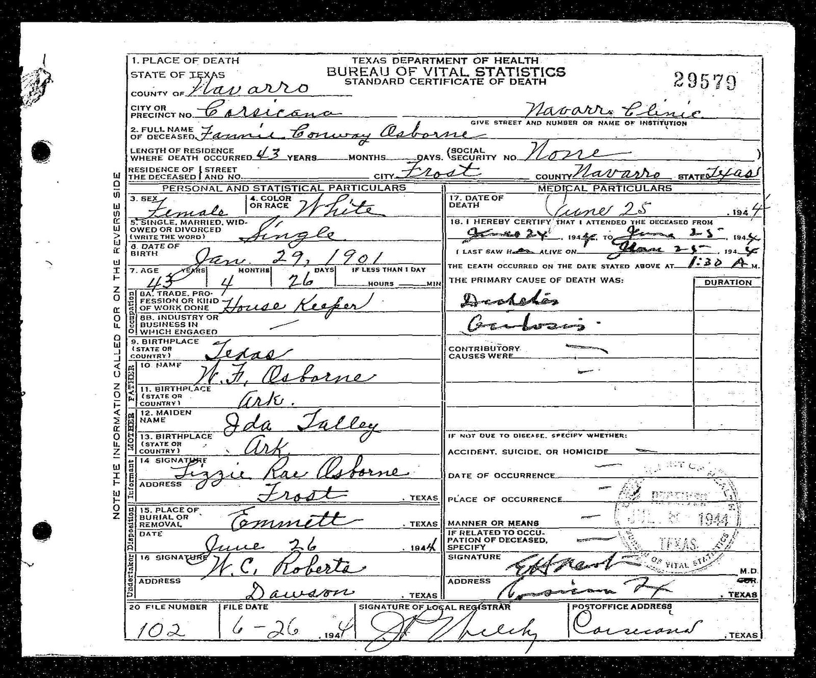 s/o William Franklin Osborne & Ida Talula (Talley) Osborne d. in Navarro Co. TX |
