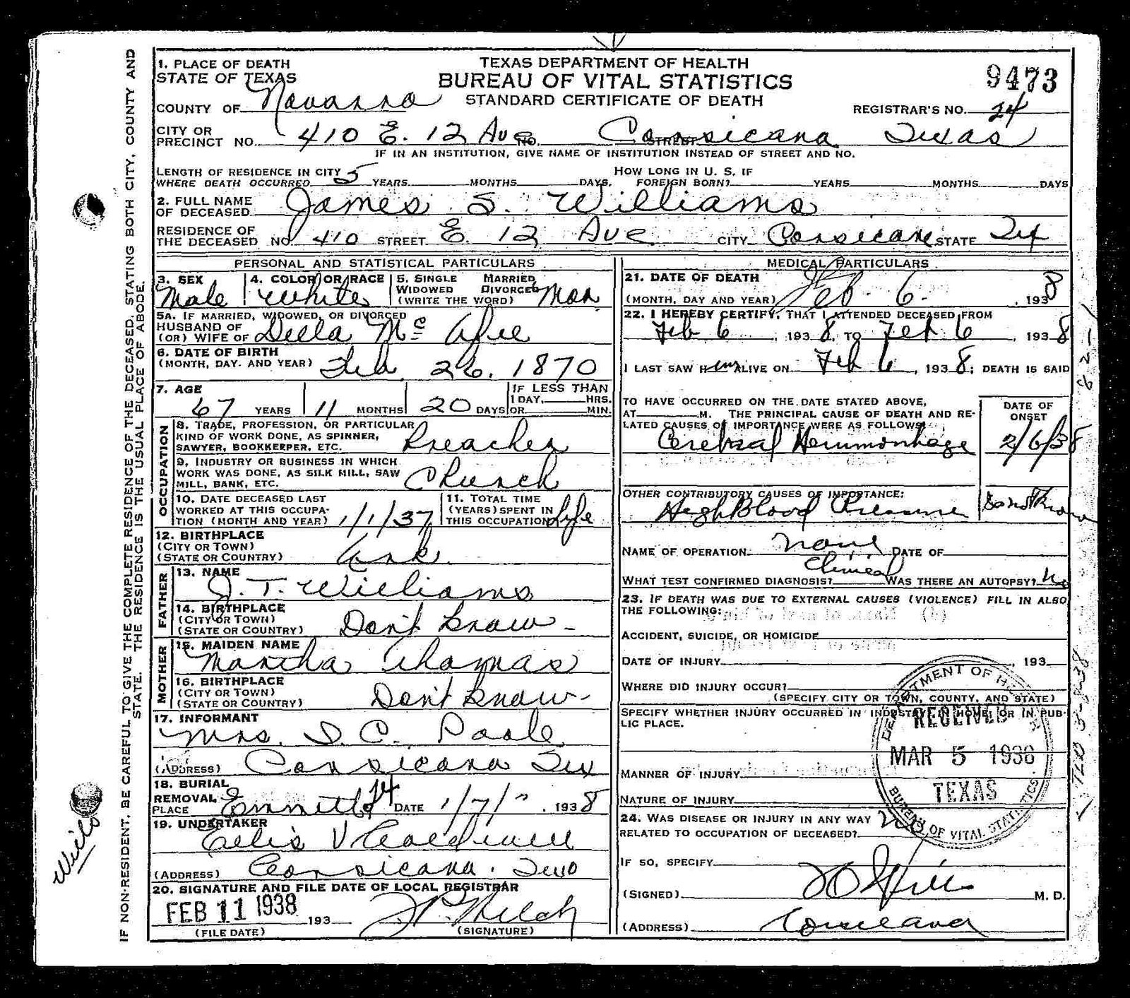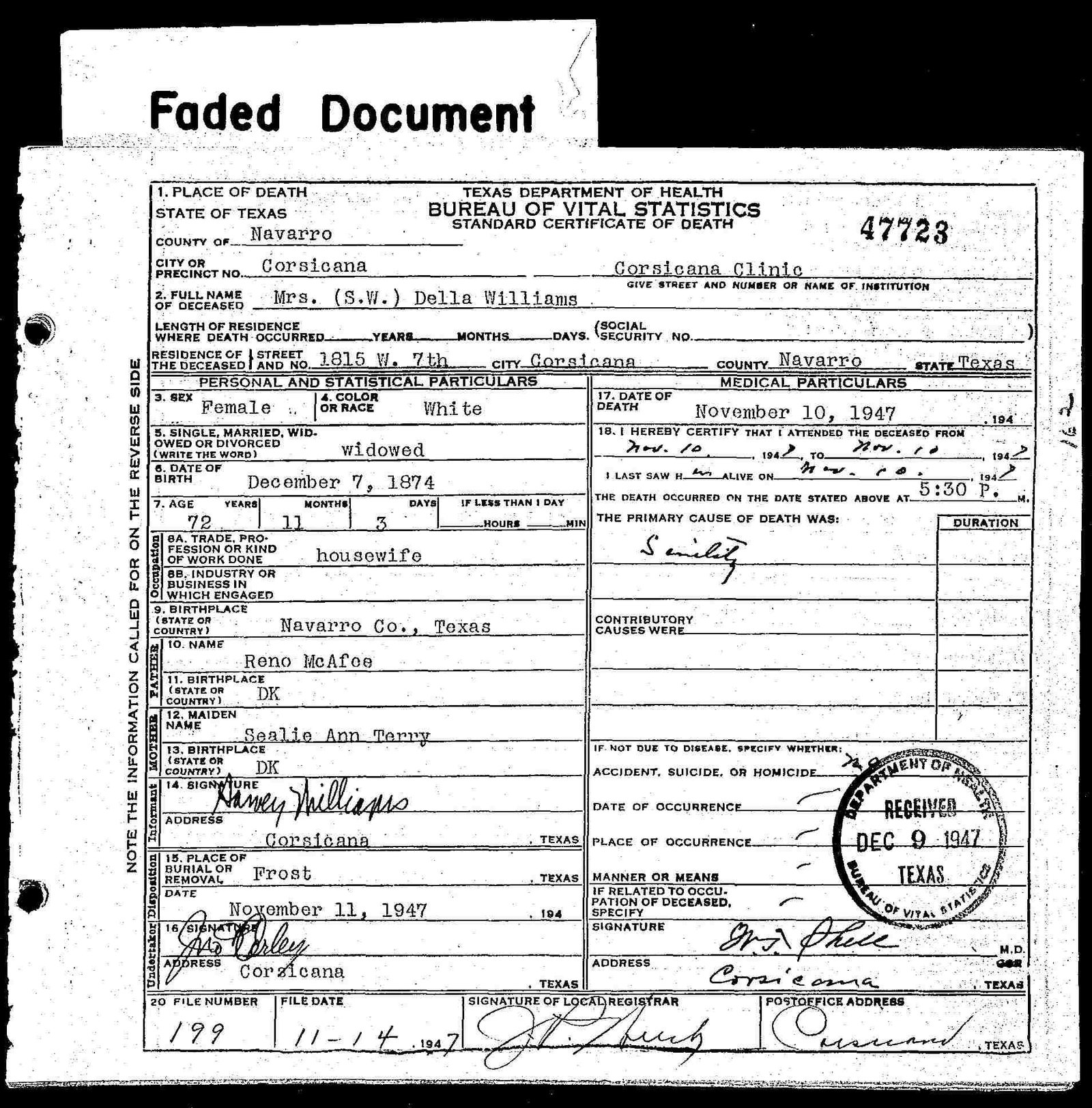 & Della Caldonia (McAfee) Williams b. in Navarro Co. TX d. in Navarro Co. TX