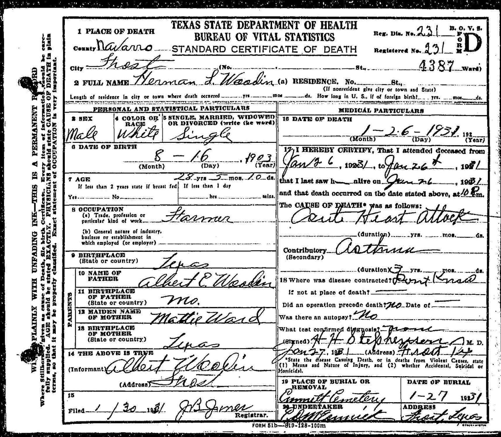 Death Cert has DOB: Aug 16, 1903; s/o Albert E. Woodin & Mattie (Ward) Woodin