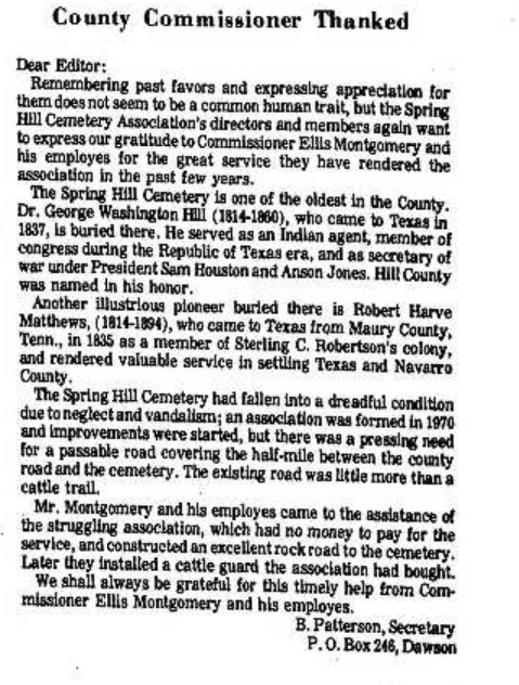 Spring Hill Cemetery Misc News Articles Spring Hill, Navarro County, Texas