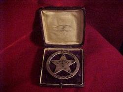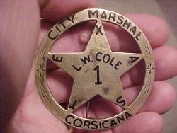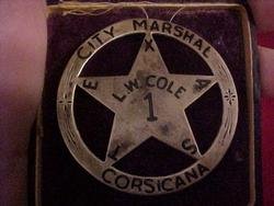 THIS IS A COIN SILVER BADGE FOR L.W. COLE " CITY MARSHAL " CORSICANA TEXAS. CIRCA 1890-1900. THIS IS A JEWELERS MADE BADGE WHICH IS HAND CUT AND ENGRAVED WITH BLACK HARD FIRED ENAMEL. SHOWS NICE ORIGINAL AGE. THE CASE IS MARKED M.O. NOBBE & COMPANY INC. JEWELERS GALVESTON TEXAS, HAS BEEN IN THIS FOR MANY YEARS, CASE SHOWS WEAR FROM BADGE. BADGE MEASURES A LITTLE OVER 2 1/4" IN DIAMETER. HAS A T PIN ON THE BACK. Note: - This badge appeared on eBay at auction during Sept 2001
