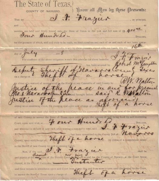 Horse Thief Court Document filed August 23, 1888 in Corsicana, Texas. J. T. Frazier is charged with theft of a horse. It names his sureties to the tune of $500 for his bail; and the names of the sheriff, a deputy sheriff, and a Justice of the Peace.