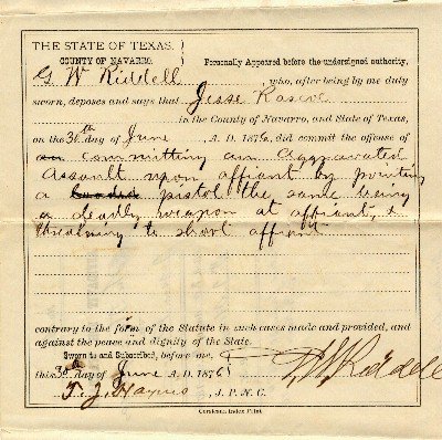 Dated 30th June 1876 Navarro County Arrest warrant for Jesse