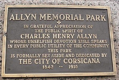 In grateful appreciation of the public spirit of Charles Henry Allyn whose unselfish devotion still speaks in every public utility of the community. This park is formally set aside and dedicated by The City of Corsicana 1842-1918.
