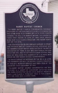 Barry Baptist Church The Barry Baptist Church congregation, originally organized as the Elam Baptist Church congregation, was established in September 1891 with seven charter members. The Rev. C. R. Roberts became the congregation's first pastor in June of 1892. Early services were held in a church structure one block north-east of this site.