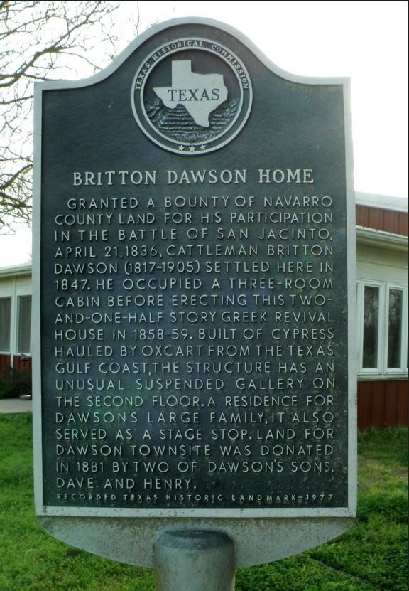 County land for his participation in the Battle of San Jacinto, April 21, 1836, cattleman Britton Dawson (1817-1905) settled here in 1847. He occupied a three-room cabin before erecting this two-and-one-half story
