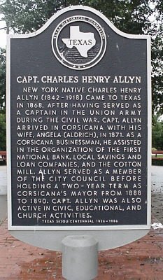 businessman, he assisted in the organization of the First National Bank, local savings and loan companies, and the cotton mill. Allyn served as a member of the City Council before holding a two-year term as Corsicana's mayor from 1888 to 1890. Capt. Allyn was also active in civic, educational, and church activities. Texas Sesquicentennial 1836-1986 Located: 7th Avenue at Beaton Street, Corsicana, Navarro County, TX The text of the historical