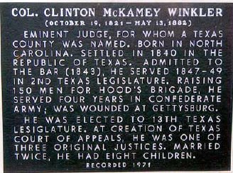 Col. Clinton McKamey Winkler (Oct 19, 1821 - May 13, 1882) (October 19, 1821--May 13, 1882) Eminent judge, for whom a Texas county was named. Born in North Carolina. Settled in 1840 in the Republic of Texas. Admitted to the Bar (1843), he served 1847-49 in 2nd Texas Legislature. Raising 150 men for Hood's Brigade, he served four years in Confederate army; was wounded at Gettysburg. He was elected to 13th Texas Legislature. At creation of Texas Court of Appeals, he was one of three original justices. Married twice, he had eight children. Recorded 1971 Location: Oakwood Cemetery, Corsicana, Navarro Co., TX
