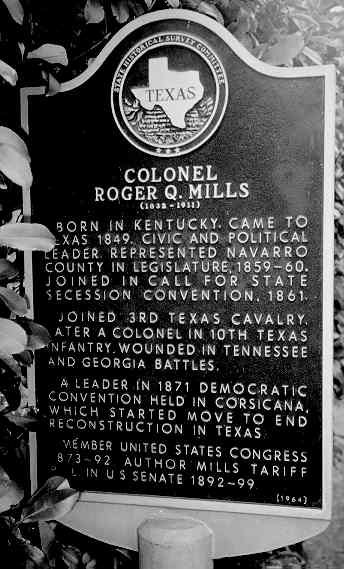 Colonel Roger Q. Mills (1832 - 1911) Born in Kentucky. Came to Texas 1849. Civic and Political leader represented Navarro County in Legislature 1859-60.