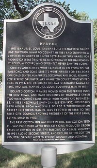Kerens The Texas & St. Louis Railway built its narrow gauge line through Navarro County in 1881 and surveyed a 270-acre town site here. The settlement was named for Richard C. Kerens (1842-1918), an official of the railroad in St. Louis, Missouri, who evidently never saw the town. Streets and blocks were laid out in relation to the railroad, and some streets were named for railroad officials: Senter, Humphreys, Goodman, and Sloss, renamed for Kerens' daughter Mrs. Hamilton Colket, who visited here in 1941. The railroad became standard gauge in 1887, and was renamed St. Louis Southwestern in 1891. Isolated cotton farmers moved from the prairie into the new town, and many residents of Wadeville (then two miles south) transferred their homes and businesses. In 1883 Theophilus Smith Daniel (1851-1933) moved his 1878 house from Wadeville to 200 S. Throckmorton Street in Kerens. Daniel was elected in 1888 to the first city council and was president of the first bank, established in 1900. The first cotton gin was built in 1883, and cotton seed oil was processed after 1899. City gins produced 23,000 bales of cotton in 1933. The building of a state highway in 1931 along Second Street, and decline of the cotton industry greatly altered Kerens' growth and economy. Texas Sesquicentennial 1836 - 1986 |