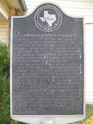 days of Emhouse, it has been a leader in community service and involvement. In addition, the church has been led by a number of prominent Baptist preachers, including the Rev. Dan Sharpley, who grew up here and later served as a missionary in Brazil. Location: N. Seely and Gamble St. off FM 1126, Emhouse, Texas
