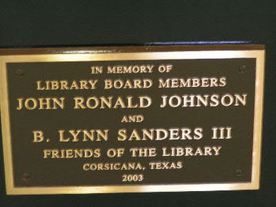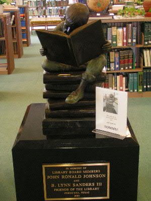 In November 2003, the Friends of the Corsicana Public Library dedicated a statue of a young boy reading in memory of B. Lynn Sanders III and John Ron Johnson. Both men had been serving as library board members at the time of their death.