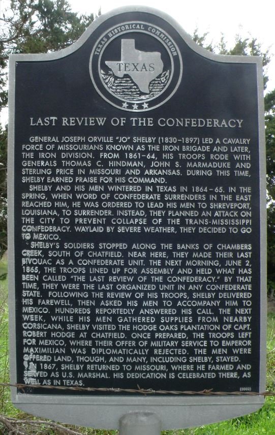 LINED UP FOR ASSEMBLY AND HELD WHAT HAS BEEN CALLED "THE LAST REVIEW OF THE CONFEDERACY." BY THAT TIME, THEY WERE THE LAST ORGANIZED UNIT IN ANY CONFEDERATE STATE. FOLLOWING THE REVIEW OF HIS TROOPS, SHELBY DELIVERED HIS FAREWELL, THEN ASKED HIS MEN TO ACCOMPANY HIM TO MEXICO. HUNDREDS REPORTEDLY ANSWERED HIS CALL. THE NEXT WEEK, WHILE HIS MEN GATHERED SUPPLIES FROM NEARBY CORSICANA, SHELBY VISITED THE HODGE OAKS PLANTATION OF CAPT. ROBERT HODGE AT CHATFIELD. ONCE PREPARED, THE TROOPS LEFT FOR