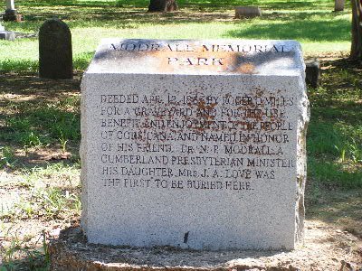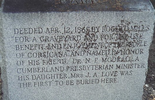 Modrall Cemetery Modrall Memorial Park. Deeded April 12, 1865, by Rodger Q. Mills, 'for a graveyard and for the use, benefit and enjoyment of the people of Corsicana,' and named in honor of his friend Dr. N. P. Modrall, a Cumberland Presbyterian minister. Mrs. J. A. Love,