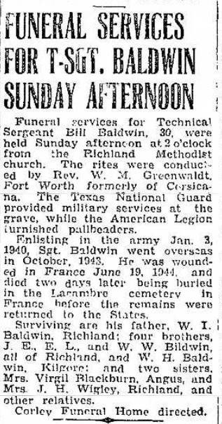 Dallas; Mrs. R. F. [Dorothy] Bartlett, Jr., Fort Knox, Ky., and Mrs. Hugh [Hazel] Gallemore, Fort Worth; three grand children, and two brothers, E. B. [Ethelbert Barksdale]