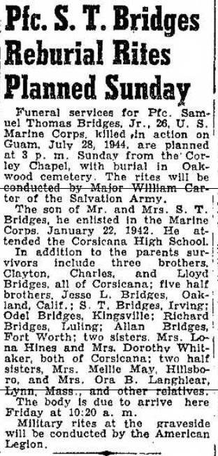 received by his wife, Mrs. Katherine Conn, Corsicana, Route No. 3. A Veteran of three