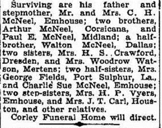 Queen, Rice; Mrs. R.F. Bartlett, Rice; Mrs. Ida Harper, Rice; and Mrs. W. S. Hollister, Dallas, and a number of nieces and nephews.