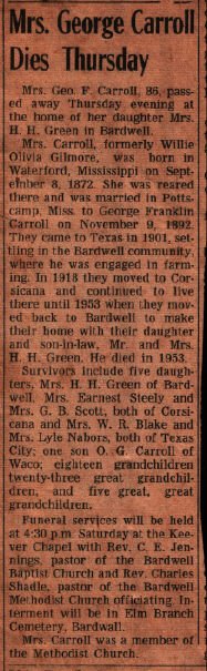 Sep 8, 1872 - Aug 1, 1959 Mrs. George Carroll Dies Thursday Mrs. Geo. F. Carroll, 86, passed away Thursday evening at the home of her daughter Mrs. H. H. Green in Bardwell. Mrs. Carroll, formerly Willie Olivia Gilmore,