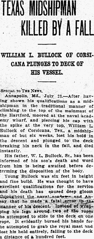 Dec 21, 1892 - Jul 21, 1912 FALL KILLS MIDSHIPMAN Tumbles from Topmast of the Hartford After a test Climb ANNAPOLIS, Md., July 21 - Midshipman William L. Bullock, a member of the fourth class, who entered the Naval Academy just six weeks ago, was killed to-day by falling from the main mast of the Hartford, after he had accomplished the feat, always attempted by new classmen of climbing to the top of the main mast of Farragut's old flagship and piercing his cap at the spike at the hightest point. He tried to slide down but the rope burned his hands, and in trying to get another hold lost his balance. Bullock fell to the deck a hundred feet below, striking the crossbars as he fell. he broke two vertebrae and injured the spinal cord, probably dying at once. Bullock's home was Corsicana, Texas, and his father, W. L. Bullock, has been notified. It is said that those on board the Hartford shouldn't have allowed any one to climb into the rigging except those on duty there or midshipmen during the regular drills. However, it is pretty well known to authorities that the midshipmen do not attempt such feats and no great effort has been made to prevent them. It is likely that there will be an investigation to fix the responsibility. July 22, 1912