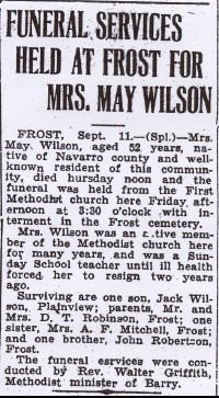 July 27, 1881 - Sept 30, 1940 MRS. W. R. DESKIN FUNERAL RITES WERE HELD ON WEDNESDAY Funeral services for Mrs. W. R. (Emma) Deskin, aged 59 years, who died Monday night, September 30, 1940, at the family home, 1123 West Collin Street, were held Wednesday afternoon at 2 o'clock from the Church of Christ. The rites were conducted by T. B. Thompson, minister, and Rev. C. C. Sessions, Methodist minister of Kerens. Burial was in the Prairie Point Cemetery. The