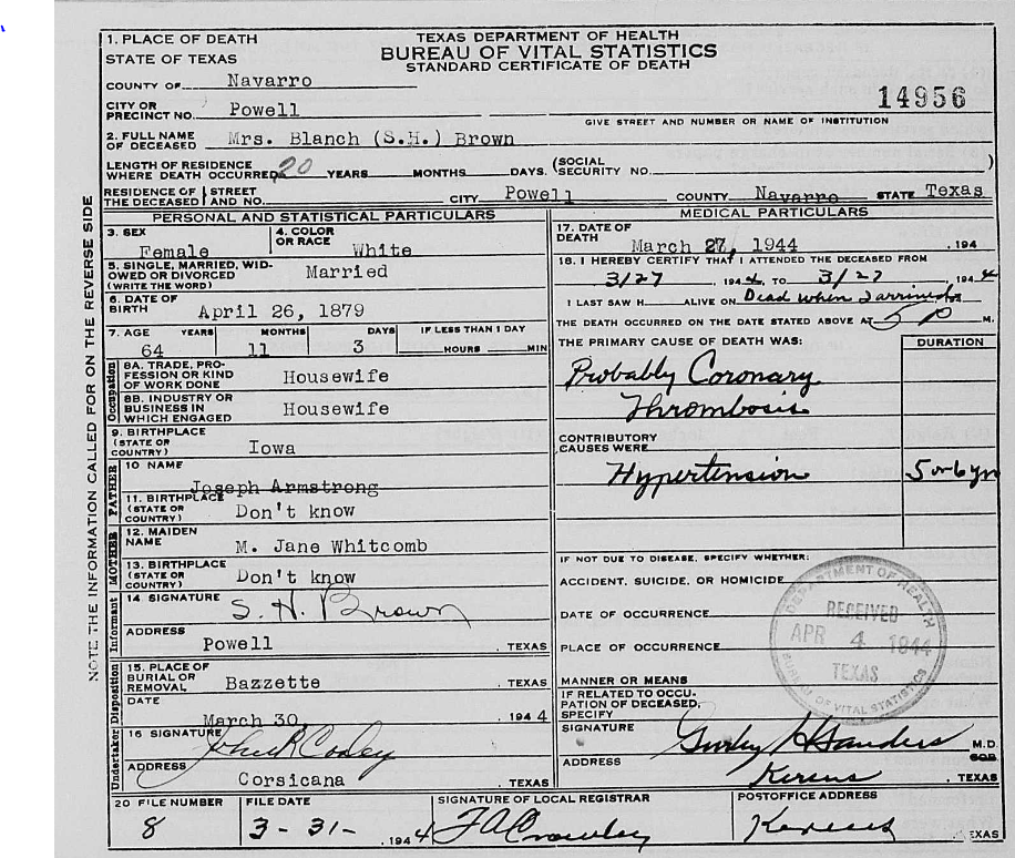 grandchildren and other relatives. Corley's Funeral Home directed the arrangements. Blanche was born April 26, 1879 to Joseph A. and Melissa Jane Whitcomb Armstrong. She married S. H.