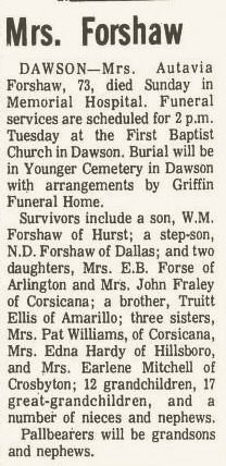 and Harold Woodard of Corsicana and Frances and Ben Wolle of New Braunfels; brother, W.M. Forshaw of Graham; sister, Lucille Arnett of Arlington; seven