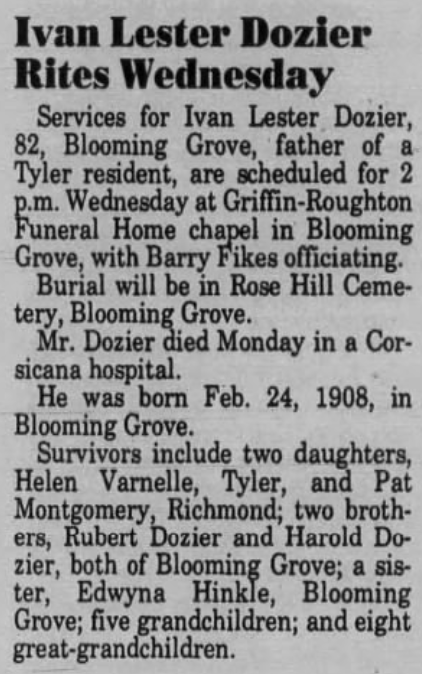 great-grandchildren, Caleb Alexander Dixon, Nicholas Aaron Deeds, and Kayla Marie Deeds; brother, Quint Loyd Dixon of Corsicana; and sister, Edith Lee