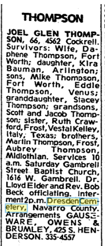 Services will be 2 p.m. Sunday at Corley Funeral Chapel with Dr. David Hale officiating. Interment will follow at Dresden Cemetery.