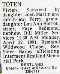 Services will be 3 p.m. today at Resthaven Mausoleum Chapel with the Rev. B. F. Risinger Jr. officiating. Interment will be at Resthaven Memorial Park.