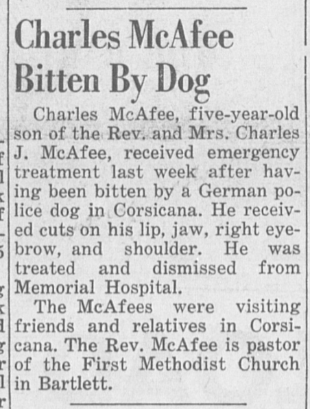 Sep 5, 1959 - May 10, 2002 COVINGTON - Charles David McAfee, 42, of Covington, founder and owner of McAfee Software Development, passes away Friday, May 10, 2002 at his home. Funeral services will be held at 2 p.m. Monday, May 13 at Crosier-Pearson-Mayfield Funeral Home Chapel in Cleburne. Burial will be at Watts Chapel Cemetery. Visitation will be from 6 to 8 p.m. Sunday, May 12 at Crosier-Pearson-Mayfield Funeral Home, Cleburne. Mr. McAfee was born Sept 5, 1959 in Waco to the Rev. Charles Joseph and Ida Fields McAfee. He graduated from University High School and Texas State Technical College with honors. He took piano lessons and then taught himself to play the accordion, drums and guitar. He played the clarinet and the tuba in high school band. He was a Boy Scout, a true Dallas Cowboy fan and an avid fisherman who was always ready to wet a hook. After the death of his father in 1995, he returned to Covington to run the farm. He is survived by a son, Kevin McAfee and wife Lindee, of Waco; a grandson, Brayden Thomas McAfee of Waco; mother Ida Fields McAfee Bowman of Joshua; two sisters and Brothers-in-law, Zelma and Marty Bielat of Covington and Janet and randy Rogan of Mesquite; numerous nieces, nephews, great nieces and great nephews. Memorials may be made to Watts Chapel United Methodist Church, 6924 CR 308, Cleburne, TX 76031 or COTA, for Andy M., c/o Wells Fargo Bank, Acct. No. 9341366244. Crosier-Pearson-Mayfield, Cleburne. Notes: